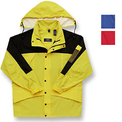 Features include: textured nylon body with water repellent finish, woven oxford cloth color-blocked yoke and sleeves, drawstring hood folds into zipper compartment, full-zip front with snap flap, mesh pocket on left sleeve, diagonal zip chest pocket, zip front pockets, D-ring glove attachment at waist, elasticized inner drawstring waist and botton hem, cuffs with velcro tab closure, Zocket™ which enables embroidery without stitching through the lining.