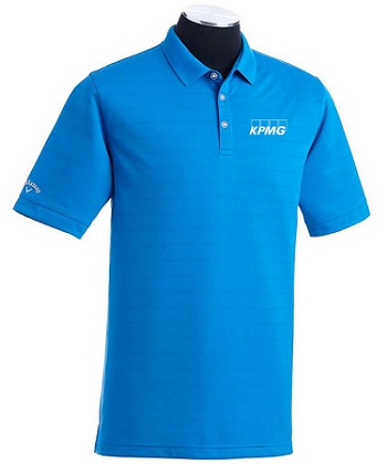 5.3 oz 100% polyester pique mesh stripe knit fabric. Opti-Dri technology transfers moisture away from the body to keep you cool and dry. Ventilated fabric allows air to flow freely through the fabric to keep you comfortable. Rib knit collar. 3-button placket with Callaway embossed buttons. Double needle hemmed bottom with side vents. Heat seal label provides tag-free comfort. Contrast embroidered Callaway logo on right sleeve and KPMG logo on left chest. See BR-1490 for Ladies option