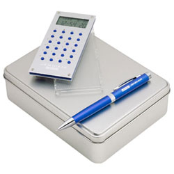 This gift set includes a slim brushed metal and silver toned plastic calculator with global time scale for 16 cities, calendar and alarm clock. Also include a brass barreled twist action ball point pen laser engraved with your logo.The two items are nicely set in charcoal colored foam inside a brushed silver box.