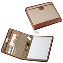 Made of chestnut colored top-grain leather and cotton twill, this beautiful and functional zippered padfolio is an item your recipient will treasure. Features durable and stylish top-grain leather, easy-care cotton twill, Cutter and Bucks signature lining, organizer for business essentials, logod Cutter and Buck writing pad. Also included a Colonnade pen with brass barrel and cap.