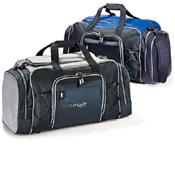 Urban design influences in color blocked 840D nylon dobby with braidcord zipper pulls, shockcord detail, smooth black PVC trim. Roomy main compartment with speed zip entry stashes gear for sports or travel. “D” shaped front zip pocket, zip shoe tunnel and end pocket add storage options. Handle grip and side grab handle.