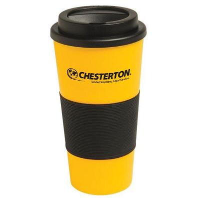 This double-wall insulated tumbler makes handling hot drinks easy when on the go. The 16oz. design features a silicone comfort grip with matching twist-on lid. It fits most auto cup holders and is BPA free. This product is reusable and top rack dishwasher and microwave safe.