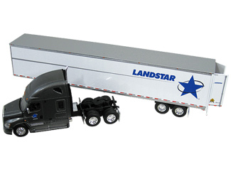 LSC-329 Landstar Freightliner Cascadia Trailer FREIGHTLINER CASCADIA HIGH ROOF SLEEPER TRACTOR 1:64th Scale die cast construction Opening hood revealing detail engine. Detailed cab and chassis. Suspension replication. Free rolling wheels and positionable front wheels. 53’ REPLICA DRY GOODS TRAILER 1:64th Scale die cast construction. Detailed Chassis. Suspension replication. Free rolling wheels. Opening split rear doors revealing a detail trailer interior. Adjustable jack stands. Price: $63.00