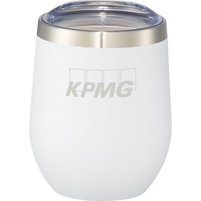 Durable, double-wall 18/18 stainless steel vacuum construction with copper insulation, which allows your beverage to stay cold for 24 hours and hot for at least 6 hours. The construction also prevents condensation on the outside of the tumbler. Easy sipping, push-on lid. Wide opening for comfortable filling and pouring. 12oz. Durable powder spray color-white with KPMG logo. 4.45" H X 3.31" W X 3.31" D