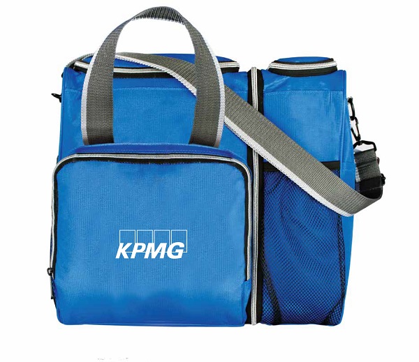 Two fully insulated compartments with heat-sealed liners. This cooler bag is perfect for transporting food & beverage. Both zip apart into two separate coolers. Holds 24 cans in the large compartment and 6 cans or two bottles in the divided small compartment, and/or all the necessary food for an outing. Two side pockets on the small cooler. Zippered front pocket and mesh side pocket. Adjustable non-slip shoulder strap that will also clip to the small compartment when unzipped from the main compartment. Material: 420 Rip-stop Polyester Dimensions: 15"L x 8.5"W x 13.5"H Royal Blue with KPMG Logo.