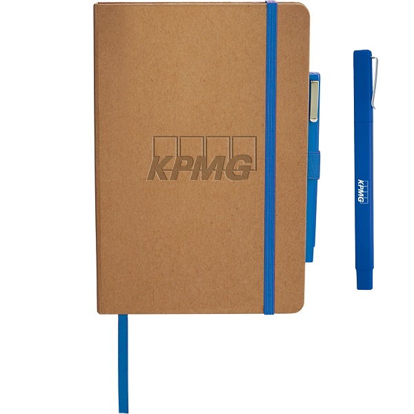 Set includes Eco Color Bound JournalBook and Ambassador Square Ballpoint. Recycled paper hard bound cover. Color accent painted edge pages. Color matching built-in elastic closure and pen loop. Ribbon page marker. Expandable accordion pocket. Includes 80 sheets of lined paper. Dimensions: 8.5" H X 5.67" W X 0.55" D Through a partnership with 1% For The Planet, one percent of sales of this and all EcoSmart products will be donated to nonprofits dedicated to protecting the planet.