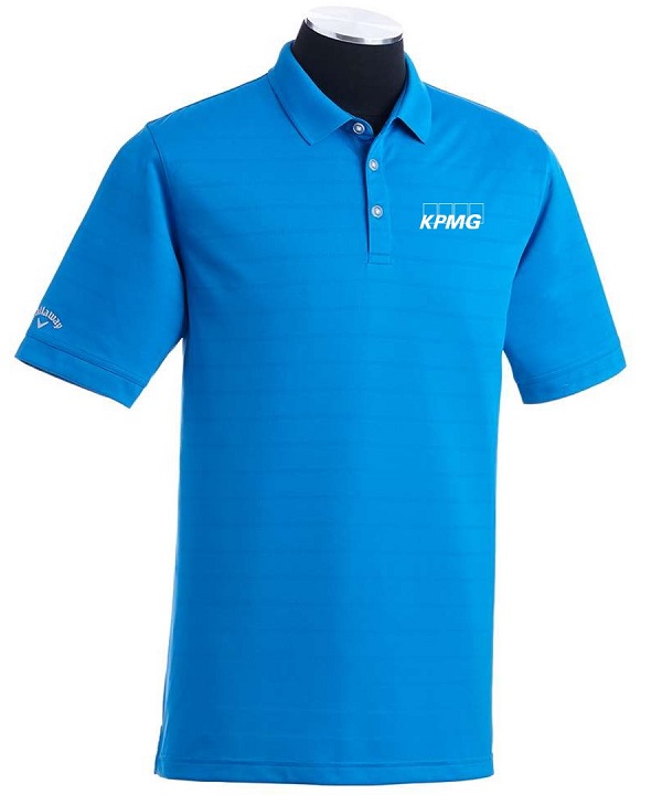 5.3 oz 100% polyester pique mesh stripe knit fabric. Opti-Dri technology transfers moisture away from the body to keep you cool and dry. Ventilated fabric allows air to flow freely through the fabric to keep you comfortable. Rib knit collar. 3-button placket with Callaway embossed buttons. Double needle hemmed bottom with side vents. Heat seal label provides tag-free comfort. Contrast embroidered Callaway logo on right sleeve and KPMG logo on left chest. See BR-1490 for Ladies option