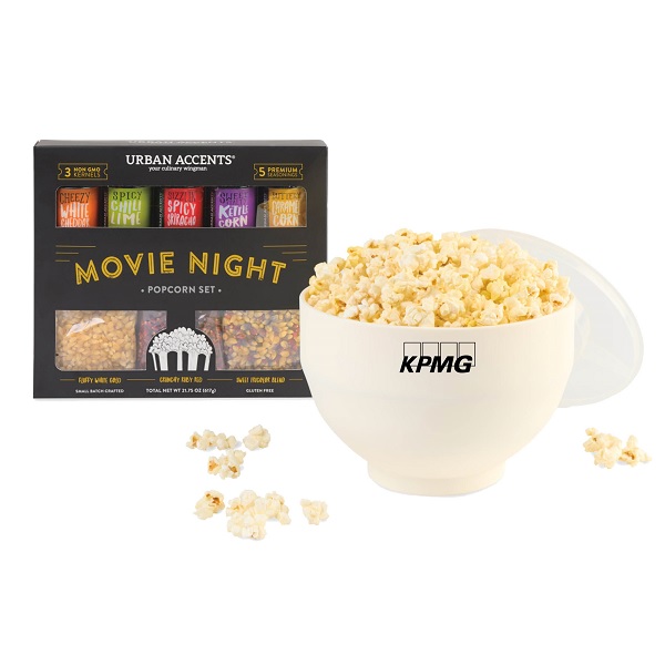 Movie Night Popcorn, a fun team reward, a themed event, or a promotional perk, this gift set of non-GMO Project Verified kernels with multiple seasonings is sure to please any craving. Includes: Urban Accent Assorted Popcorn Kernels and Seasonings. W&P® Popcorn Popper: a collapsible popcorn bowl/popper thats made from food-safe silicone and plastic. BPA free. Dishwasher and microwave safe. Just add popcorn kernels in the bowl, oil or butter, cover & microwave until popped, then add salt or seasonings. All items are packaged in an eco-friendly kraft box mailer. Dimensions: 11"L x 15"H x 5"W