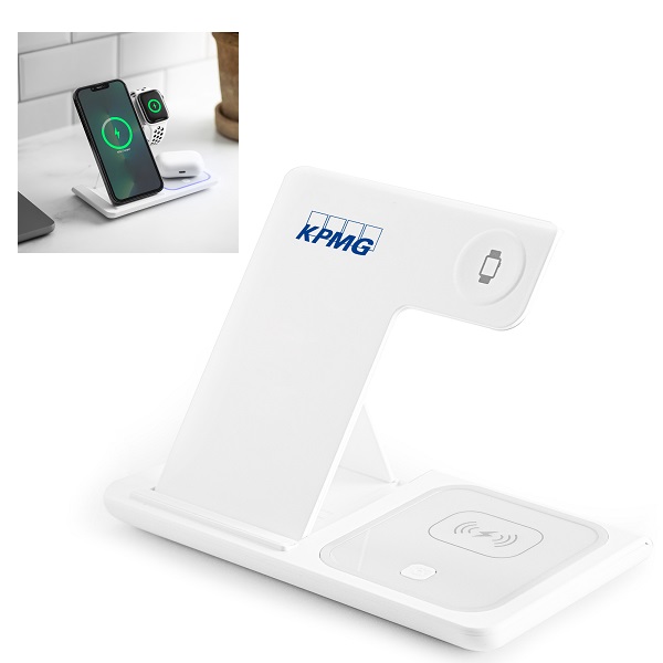 Experience the convenience of the LED Wireless Recharging Station! Designed around a blazing fast 15 watt Qi charging phone stand, this item also includes a built in Apple Watch charger, a charging station for any Qi earbuds and a LED light. Truly an all-in-one design that makes the perfect gift. - Prop 65 certified