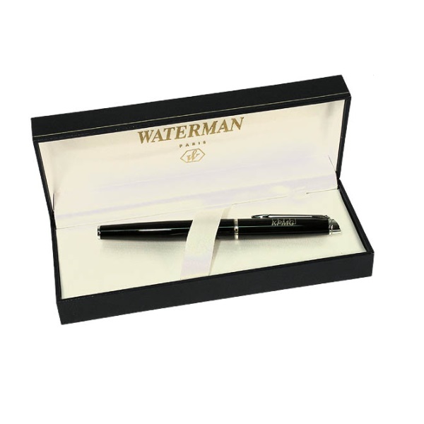 BR-662 Waterman Hemisphere Rollerball Pen Black Lacquer Waterman Hemisphere Rollerball Pen engraved with KPMG logo.Fine point pen. Black ink.Minimum to order: 15Please allow 8-10 business days for production***PLEASE NOTE: FREIGHT CHARGE IS ACTUAL FREIGHT QUOTED TO YOU AND WILL BE CHARGED WHEN ORDER IS SHIPPED AND BILLED*** Price: $73.75 ea.